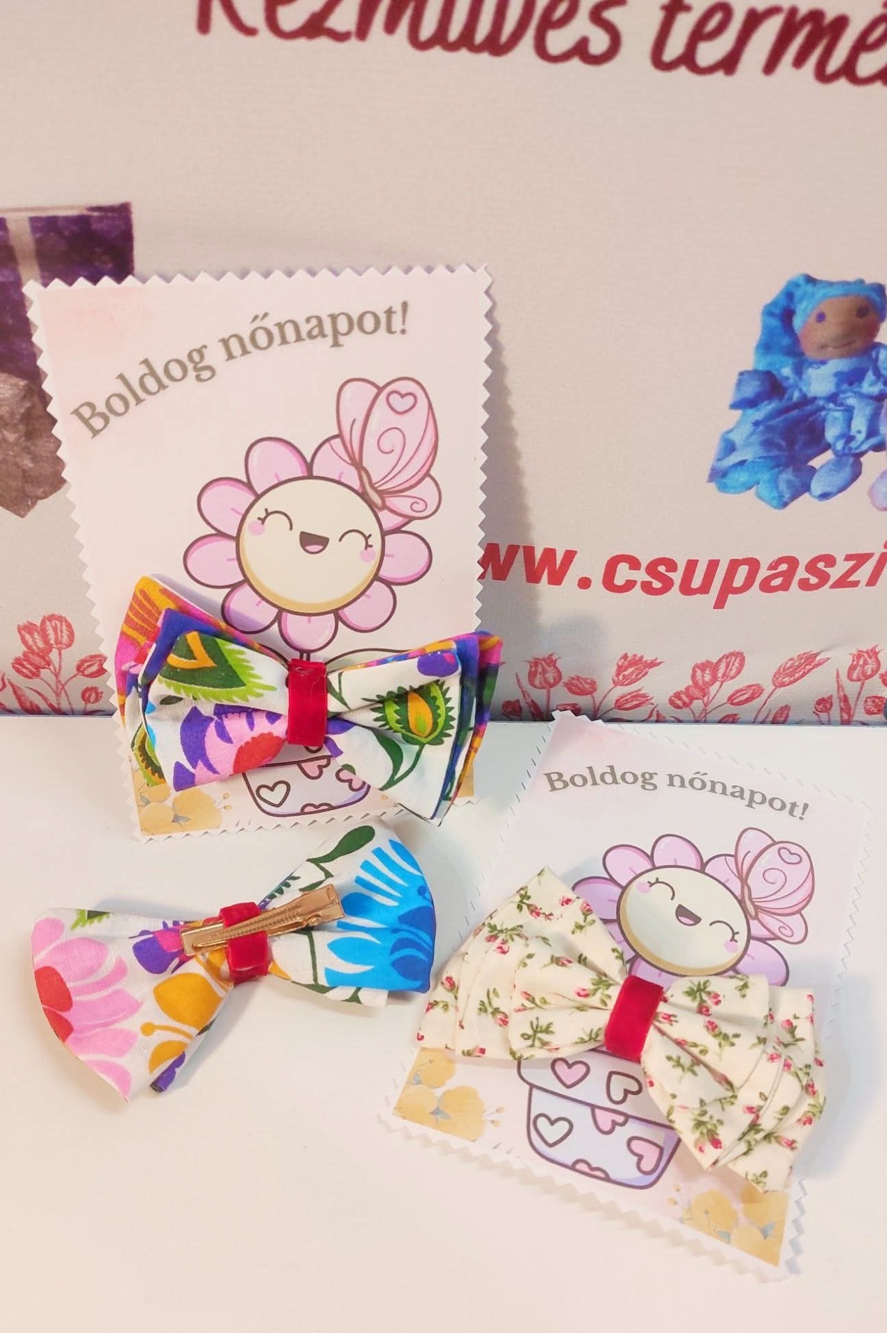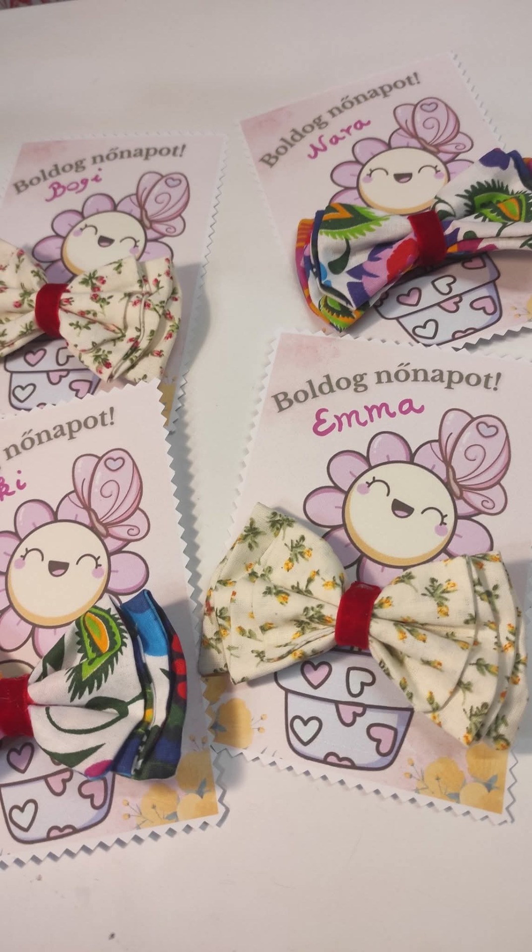Aranyos kézműves masnis hajcsat viràgos köszönő kàrtyàn. Kérhető rà név is, hogy igazàn személyre szóló legyen!